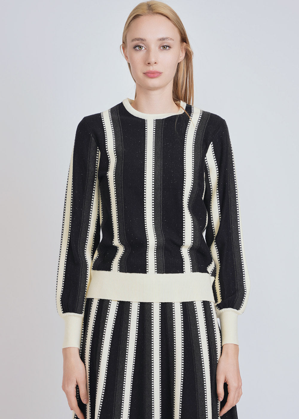 A modern knit top with contrasting white accents that create a sleek, streamlined look. Ideal for professional or casual settings.