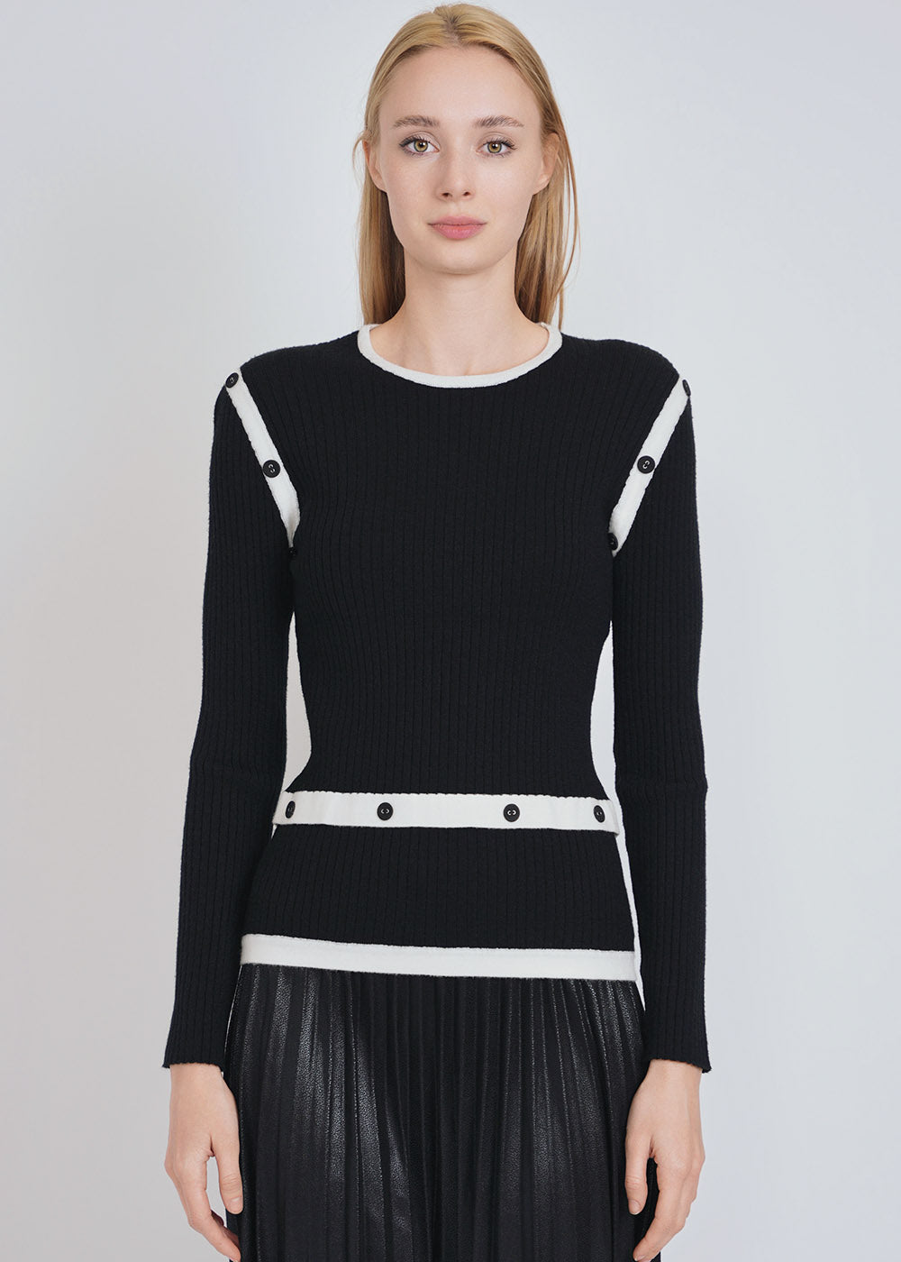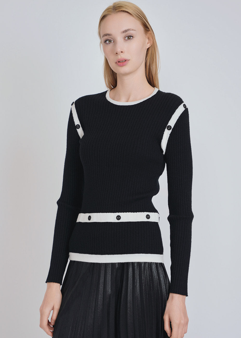A timeless piece, this black ribbed knit sweater features chic white button bands that offer a striking visual contrast. It’s a versatile addition that can transition seamlessly from a day at the office to an evening out, making it a staple in any well-curated wardrobe.